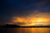 雲に隠れた夕陽。金色の空と海、そしてアクアマリンのシルエット。