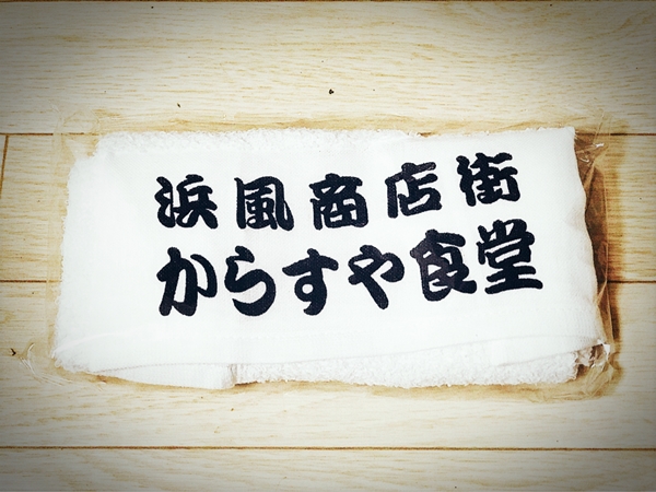 「浜風商店街 からすや食堂」と入ったタオルをいただきました。大切にします。
