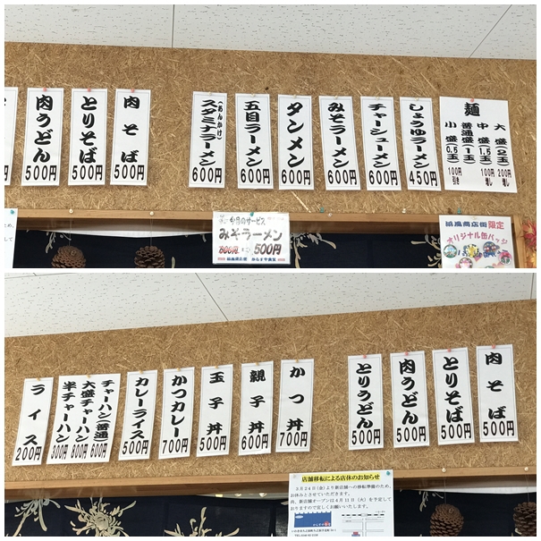 からすや食堂のメニュー。お父さんのお話によると新店舗へ移転後は少しずつメニューを増やしていきたいなということでした。