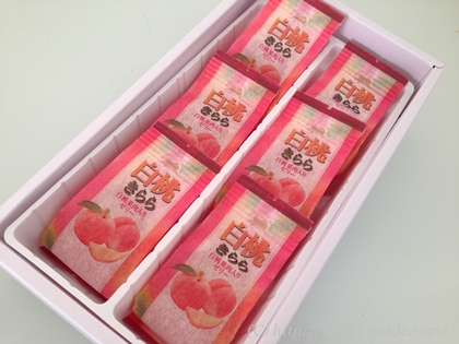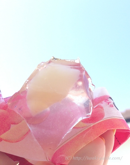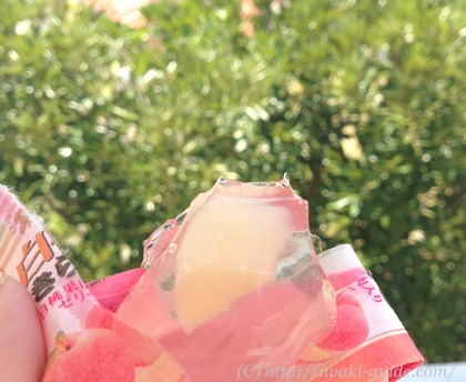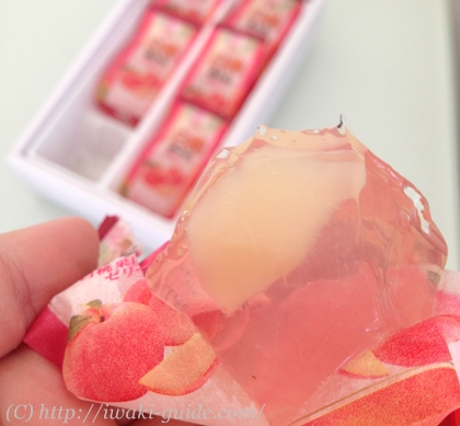 とした、透明ゼリーの中に桃の果肉が入っています。