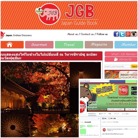 Facebookページ15万6千人以上の「いいね!」、WEBサイトやアプリなど多方面で展開しているJGB(Japan Gourmet Bangkok)にお声かけいただきまして、タイに向けていわき情報を連載する機会を頂戴しました。