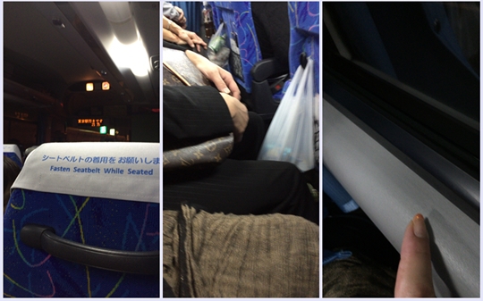 高速バスは前後とも隣の席とも接近。そして窓側に座ったとしてもこの窓の枠が狭いのでここに腕をおくことができません。これはかなりキツイです(^_^;)