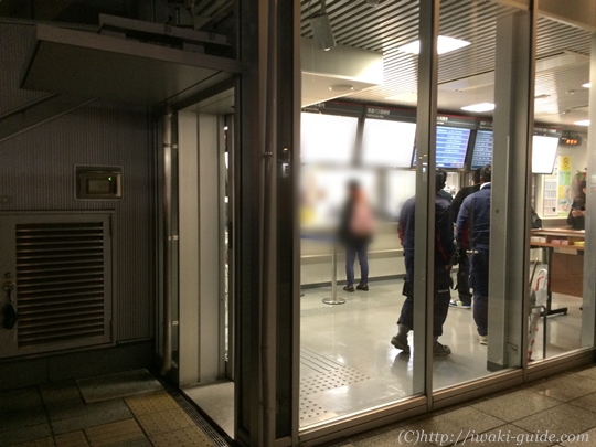 いわき駅ペデストリアンデッキ中央のこのエレベーターで降りると東京行きの高速バスの乗り場があります。