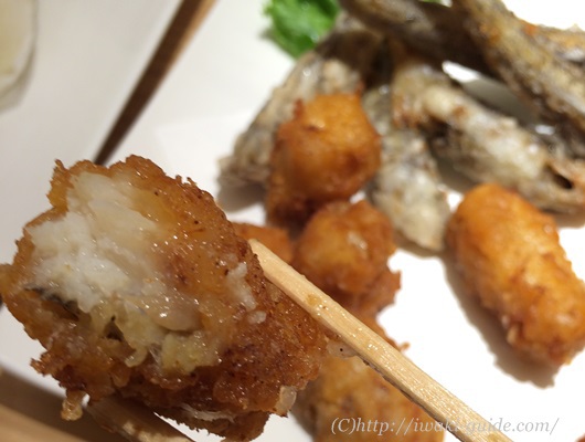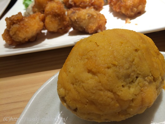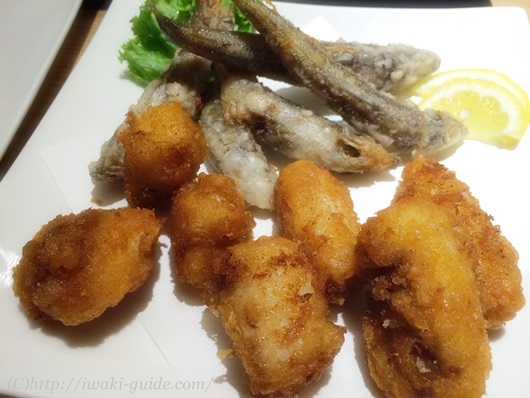 こちらは、いわきの魚メヒカリの唐揚げと、あんこうの唐揚げ。一つのお皿に盛りつけていただきました。