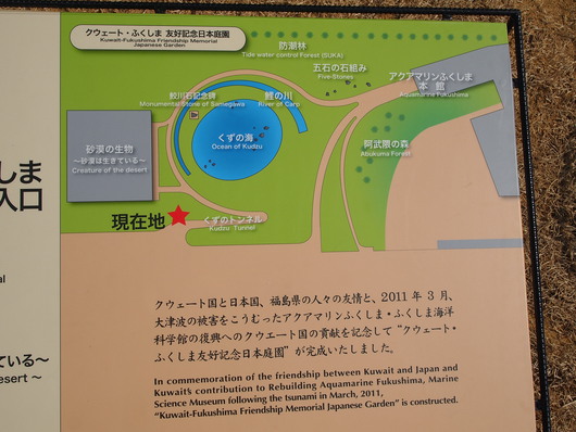 クウェート・ふくしま友好記念日本庭園はマダケの骨組みにクズをはわせた「くずのトンネル」や、クウェートの砂漠オアシスの自然を展示する「砂漠は生きている」、クウェートとの友好記念モニュメント「鮫川石記念碑」などの8つの展示から出来ています。