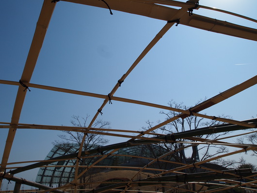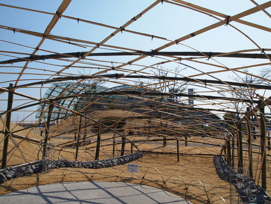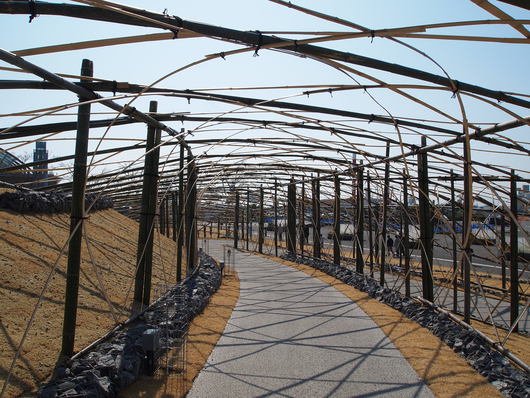 「クウェート・ふくしま友好記念日本庭園」のエントランスは、いまや荒れた里山の象徴ともなっているマダケとクズによるシンボリックなアプローチです。大國魂神社から提供いただいたマダケによる立体的な構造に、クズを誘引する。いずれクズだけで自立するふしぎな建築として、縄文の里の象徴となるでしょう。