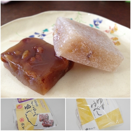 写真左は大黒屋の「くるみゆべし」、右はかんのやの「ゆずゆべし」です。
