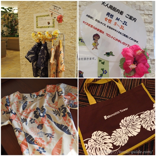 スパリゾート・ハワイアンズのホテルでは宿泊者には館内着が用意されています。部屋におかれているのは女性はMサイズなので違うサイズご希望の方はチェックインのときに言っておくと用意してくれます。