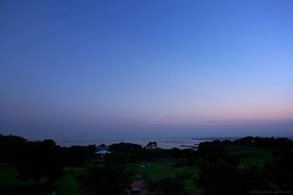 三崎公園、中央広場の下から望む小名浜港と西の空
