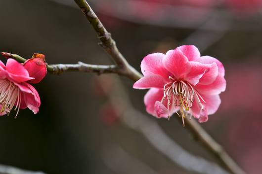 本館前に咲く八重の紅梅。