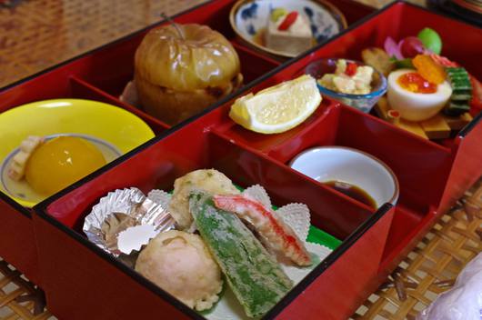 日帰りプランでの食事「加茂弁当」。この他にお造り、デザートにアイスクリームが付きます。
