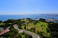 スカイデッキから芝生広場と小名浜港を。芝生はまだまだ綺麗な緑色です。
