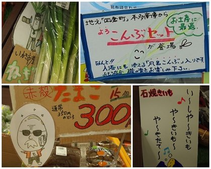 管理人Kさんが紹介されていた「道の駅よつくら港 フードコート」、一階直売所にはこんな楽しいPOPたちが。