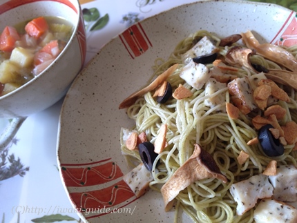 そしてスカイストア開発のオリーブ麺はたーっぷりとオリーブが練りこまれた風味豊かな麺なので、あまり濃い味のソースで調理するのはもったいない!