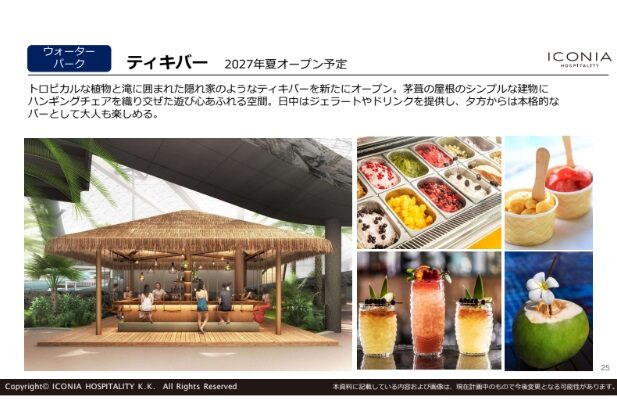 ウォーターパーク内にバーも新設されるそうです。資料にはおいしそうなトロピカルなアイスクリームも入っているので、アルコールだけのバーではなく、多くの世代が楽しめそうな雰囲気ですね。