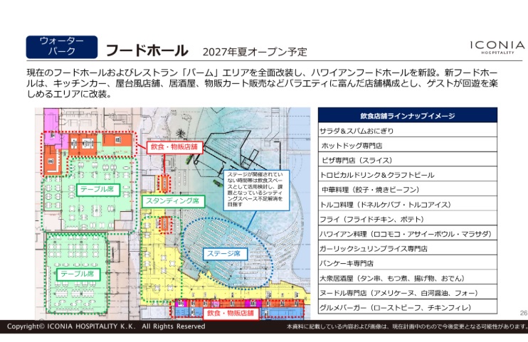 また、現在あるウォーターパーク周りのフードホールと隣接するレストラン「パーム」を全面改装して、ハワイアンフードホールを新設。キッチンカーや屋台風店舗、物販カートなどが並ぶ楽しい空間になりそうです。