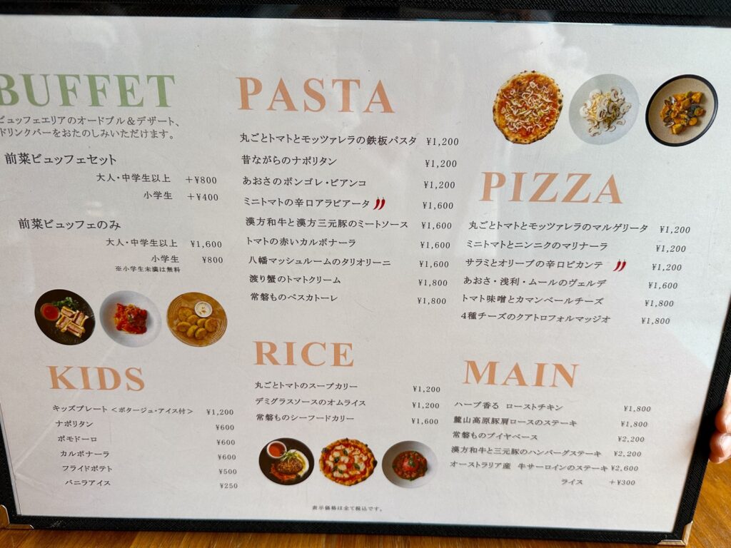 ワンダーファームのメニューは、パスタやピザ、肉類などのメインと前菜ビュッフェにする場合は、プラス800円。前菜ビュッフェだけの場合は1600円となっています。