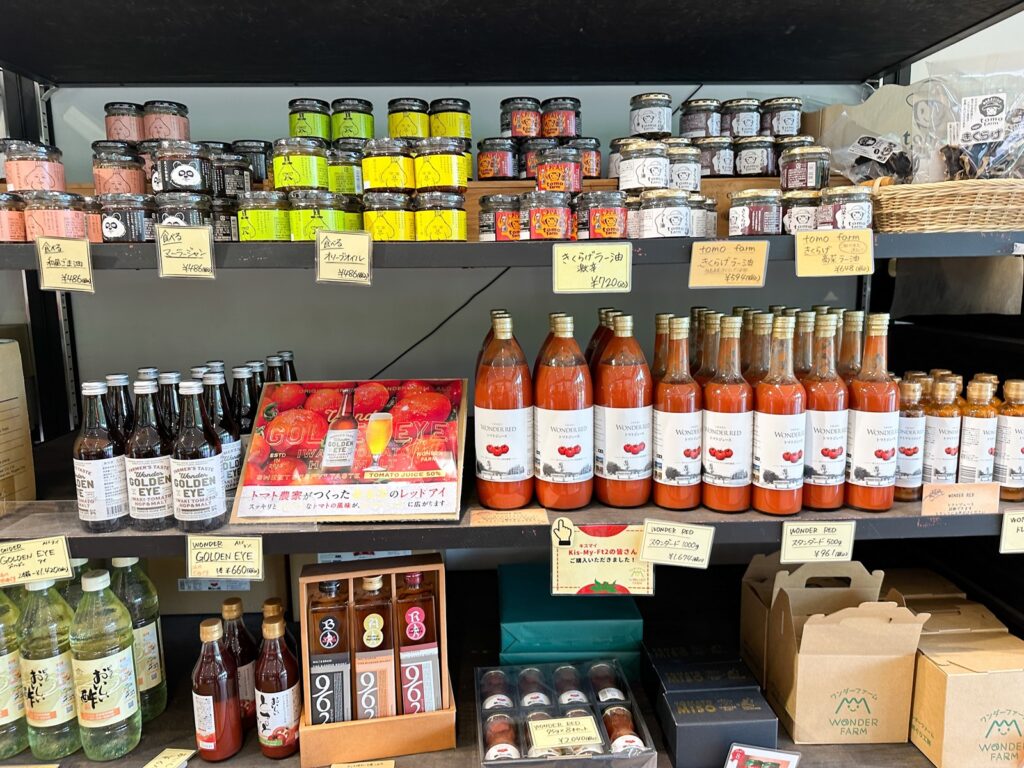 レストランの隣りにある「森のマルシェ」ではワンダーファームのトマトや調味料。その他、福島のものがたくさん。